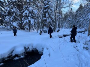 スノーシューでのハイキング中に、雪の中で見かける野生動物の足跡や痕跡を観察します。